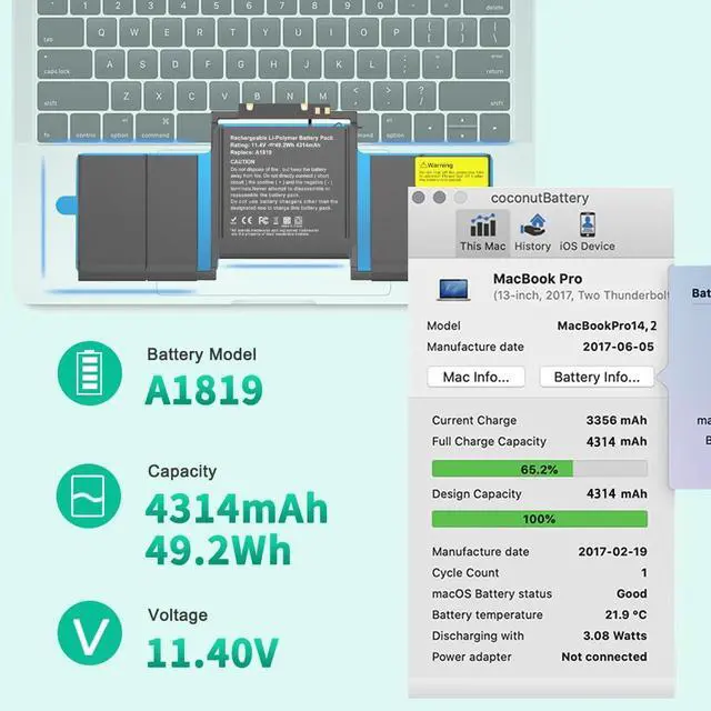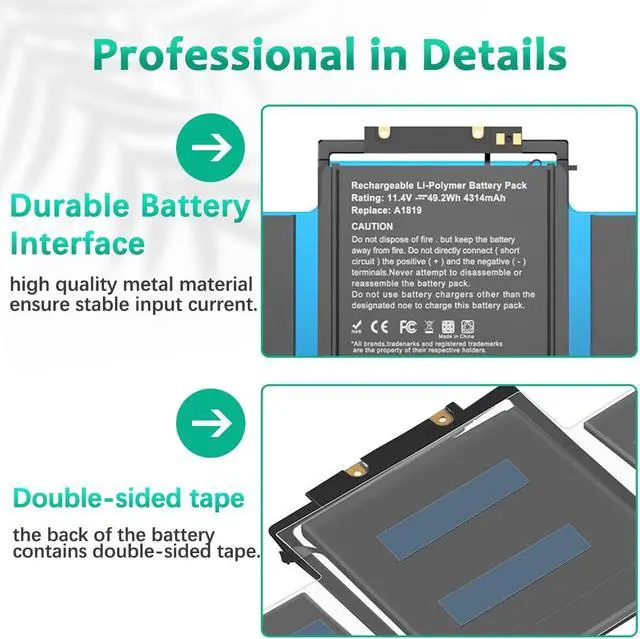 LONG-LASTING BATTERY LIFE: With 11.41V capacity (49.2Wh/ 4320mAh), the ( A1819 ) battery ensures all-day power for your laptops in a factory-fresh, never-used battery pack designed for maximum performance.