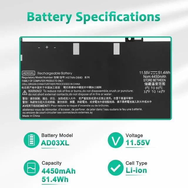 LONG-LASTING BATTERY LIFE:With 11.55V,capacity (51.4Wh/4450mAh),the(AD03XL) battery ensures all-day power for your laptops in a factory-fresh, never-used battery pack designed for maximum performance.
