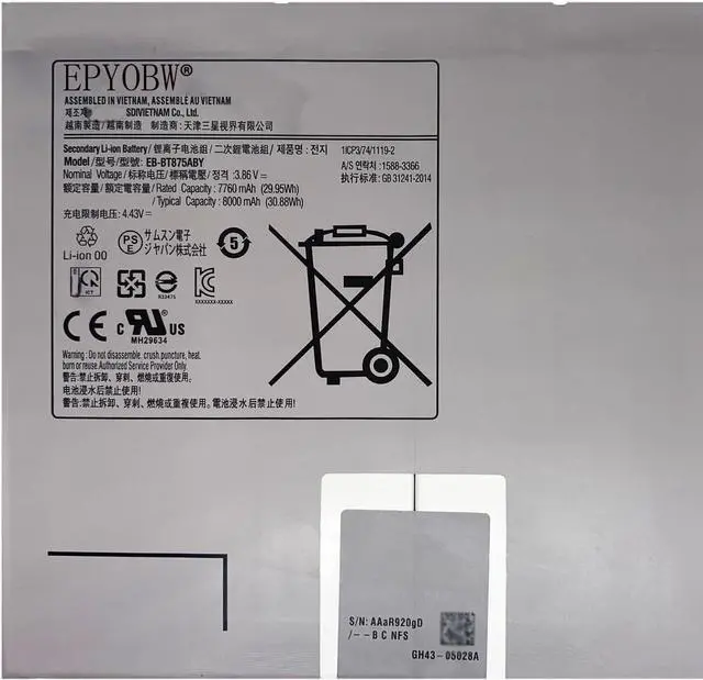 SpecificationsBattery Model: EB-BT875ABY / Voltage: 3.86V / Capacity: 30.88Wh 8000mAh / Color: White / Condition: Brand New.