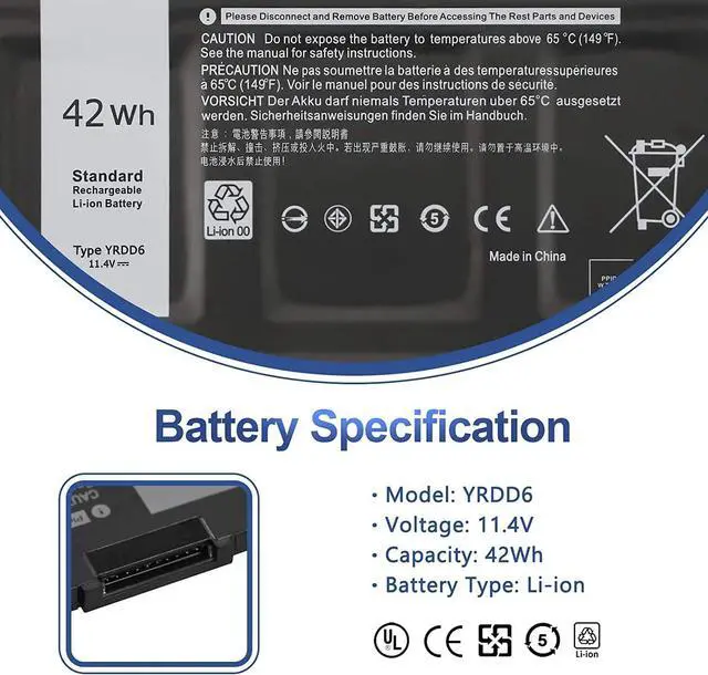 42Wh YRDD6 1VX1H Batería de Repuesto para computadora portátil Compatible for Dell Inspiron 7586 5482 5485 5491 5591 3310 2-in-1 5593 5591 5480 3493 3582 3583 3584 3593 3793 5493 5585 5590 VM732