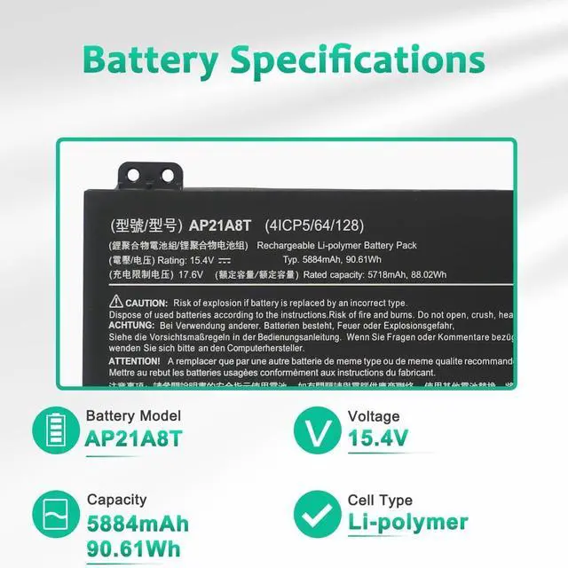 LONG-LASTING BATTERY LIFE- With 15.4V capacity ( 90.61Wh/5884mAh ), The ( AP21A8T ) battery ensures all-day power for your laptops in a factory-fresh, Never-used battery pack designed for maximum performance.