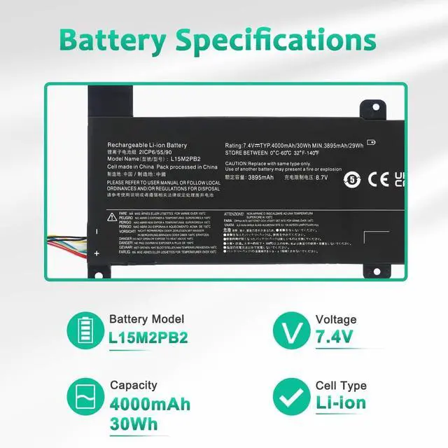 LONG-LASTING BATTERY LIFE- With 7.6V capacity ( 30Wh 4030mAh ), The ( L15M2PB2 ) battery ensures all-day power for your laptops in a factory-fresh, Never-used battery pack designed for maximum performance.