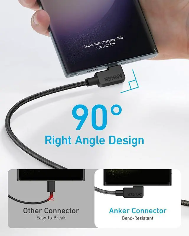A 90° Angle on Charging: Experience effortless connections with this USB-A to right angle USB-C cable, promoting easy use and safe, secure charging.