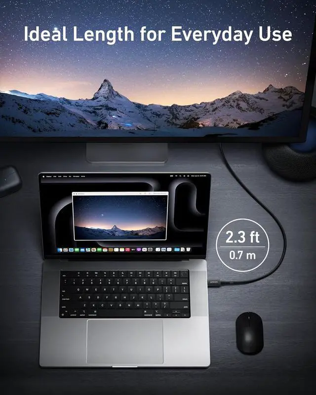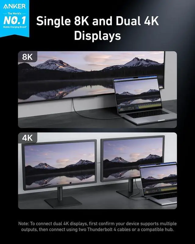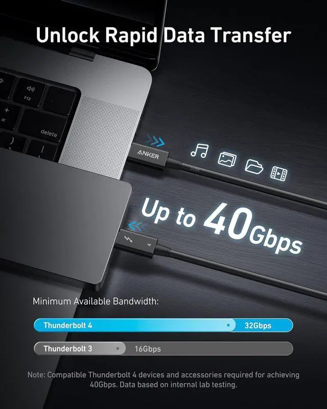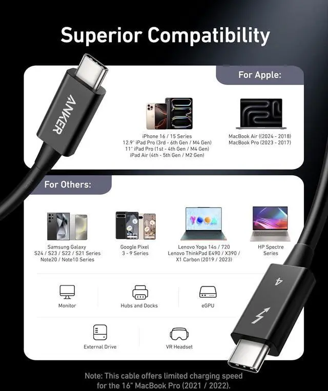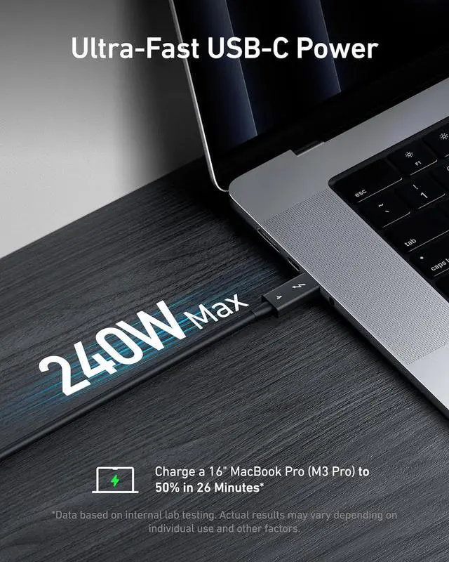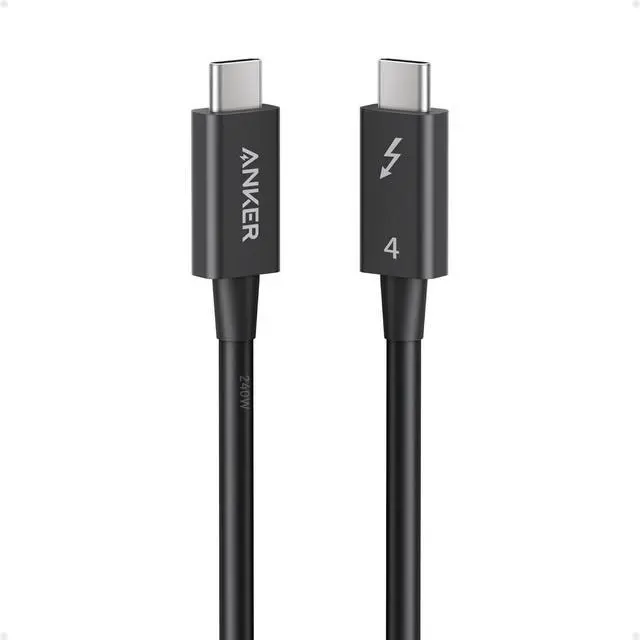 Model Number: A8859 Anker Thunderbolt 4 Cable (2.3 ft, 240W, 40Gbps) High Definition, High Speed, and High Power The Ultimate Connection This high-performance cable supports 8K and dual 4K displays, enhances your data transfer with 40Gbps speed, and powers up devices quickly with 240W charging. Link 6 Devices with Ease Seamlessly link up to six devices using the daisy chaining feature. Note: A separate Thunderbolt cable is required for each device, with only one included in your package. Thunderbolt 4-Certified Benefit from the safety and exceptional performance of a Thunderbolt 4-certified cable, designed to meet rigorous quality standards. Extensive Compatibility Connect a wide range of devices, from phones and tablets to laptops, offering comprehensive compatibility.
