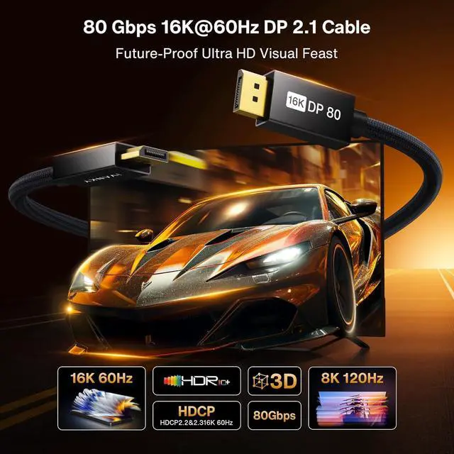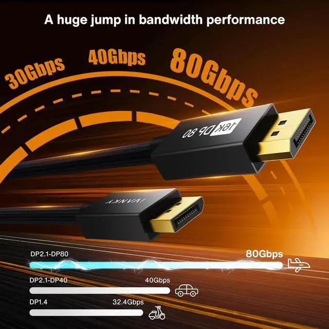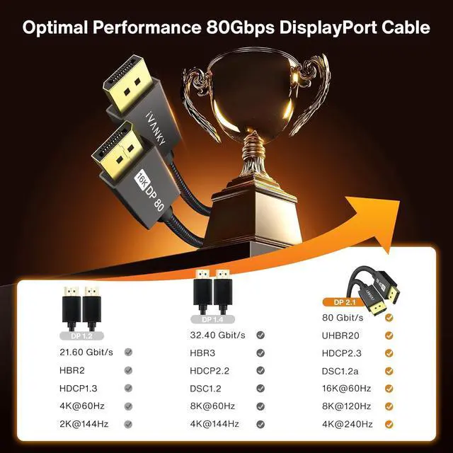 80Gbps 16K DisplayPort Cable 2.1This iVANKY 16K DisplayPort 2.1 cable delivers an unprecedented 80Gbps bandwidth, unlocking ultra-high resolutions like 16K@60Hz, 8K@240Hz, and 4K@480Hz. Whether you're indulging in immersive gaming or professional multimedia creation, it ensures every pixel shines with unparalleled clarity and smoothness; Backward compatible with DP 2.0, and DP 1.4, and supports flawless 7.1/5.1/2.0 uncompressed audio pass-thru