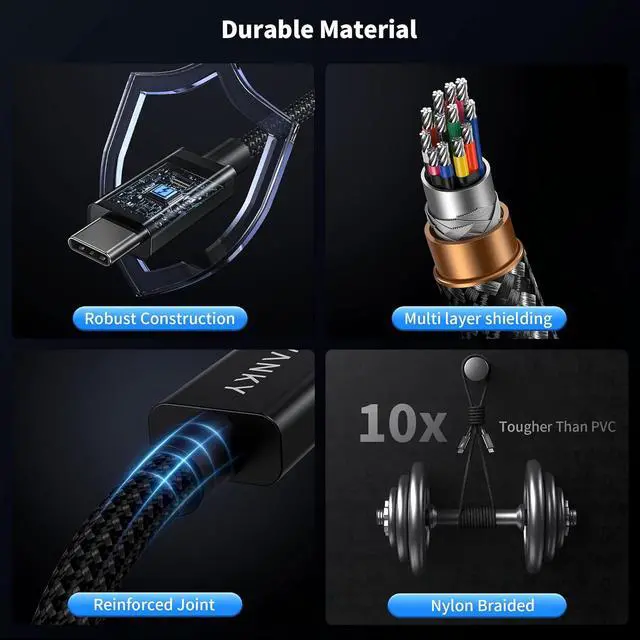 : Crafted with a proprietary braided nylon exterior, this USB C Thunderbolt 5 cable strikes the perfect balance between durability and flexibility. Unlike traditional PVC or ordinary nylon cables, it's rigorously tested under extreme conditions, effectively resisting breakage and wear, ensuring long-lasting performance