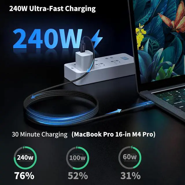 - : This Thunderbolt 5 cable supports charging speeds as fast as PD 3.1 delivering up to 240W of power to charge devices efficiently. It's backward compatible with 140W, 100W and lower power standards. It's backward compatible with 140W, 100W and lower power standards. The built-in E-Marker chip ensures safe and stable charging. This cable can directly charge laptops and USB-equipped accessories, transfer data, and output video, reducing the number of cables, streamlining the user experience, and reducing clutter