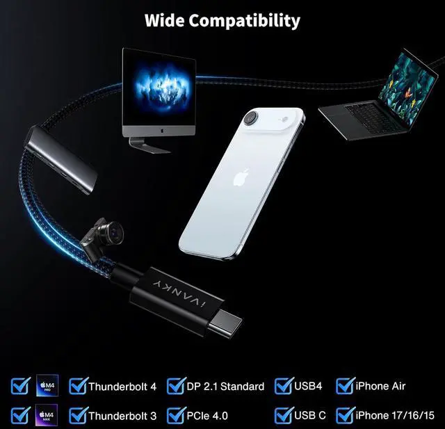 : Seamlessly connect across multiple generations of devices, including Thunderbolt 4, Thunderbolt 3, USB4, and USB-C enabled devices. Perfectly compatible for MacBook M4 Pro, MacBook M4 Max, iPhone 17/16/15, iPhone Air, Razer Blade, SSDs, USB-C monitors, docking stations, GaN chargers, eGPUs, etc., This cable is the ultimate solution for modern connectivity needs, providing the flexibility to work with both current and future devices while maintaining backward compatibility with older ones