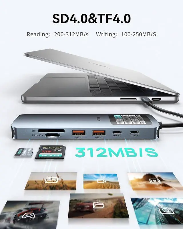 Plug and play. With this LED Docking Station, you get HDMI1(8K@30Hz)+HDMI 2(4K@60Hz), 2*USB C 3.1 Ports(10Gbps),3*USB A 3.1 Ports,PD 100W, Gigabit Ethernet port(2500Mbps),SD/TF Card Reader(Reading200-312MB/s Writing100-250MB/S) MOKiN LED Docking Station,12 IN 1 Laptop Docking Station Dual Monitor 8K@30Hz,Usb C Docking Station With 2 HDMI,PD 100W,2500Mbps LAN,5*10Gbps USB Ports,SD/TF Card Reader for MacBook/Dell/HP/Lenovo