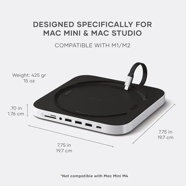 The Stand & Hub For Mac Mini / Studio With NVMe SSD Enclosure supports NVMe M.2 SSDs in multiple sizes (M.2 2230, 2242, 2260, 2280) with transfer speeds of up to 10Gbps using USB-C Gen 2 technology.