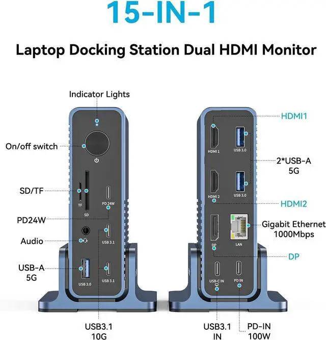All in One Docking Station Dual Monitor:This usb c docking station dual monitor equipped 4k 2*HDMI+DP+1*TF/SD +3*USB-A (5Gbps)+2*USB-C (10Gbps)+ 1*USB-C(24W PD Charging )+3.5MM Audio&MIC +Ethernet+PD100W,making it the perfect laptop docking station for video editors, photographers and gamers