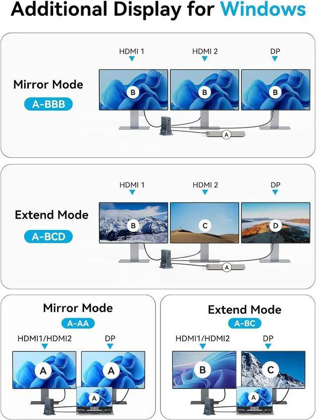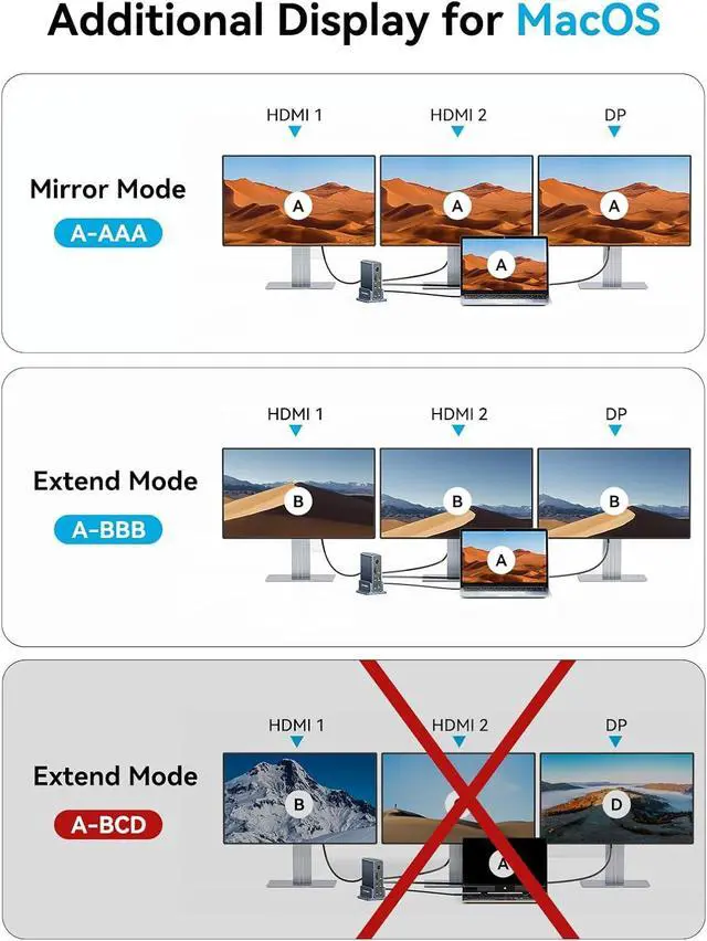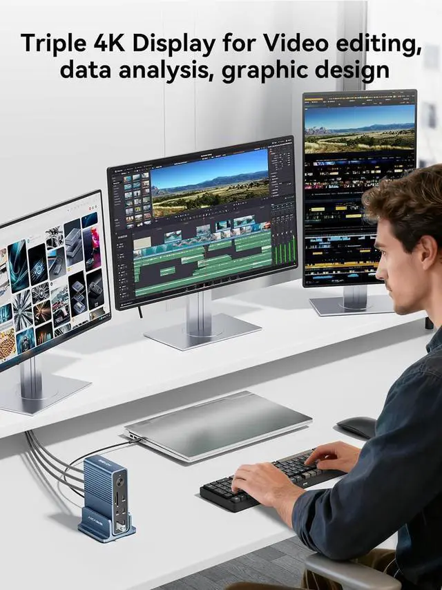 "Docking Station 3 Monitors With 4K : laptop docking station Equipped with 2x HDMI + DisplayPort, Supports three-screen different displays (A-BCD) and three-screen identical displays (A-AAA) on Windows; supports three-screen identical displays (A-AAA) on Mac. computer docking station dual monitor is Ideal for Enable dual-screen or multi-screen productivity for scenarios such as document processing, code writing, and video editing."