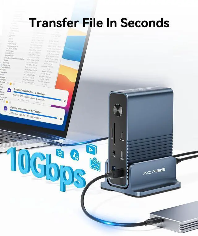 Ultra-Fast Transfer docking station : 3x USB-C ports (10Gbps) + 3x USB-A ports (5Gbps), enabling file transfers at speeds up to 10Gbps.It also supports connecting peripherals like mice, keyboards, and printers. The laptop docking station dual monitor Effectively reduce waiting time for large file transfersCommonly used for video shooting and editing, RAW format photo processing, and large file sharing scenarios.