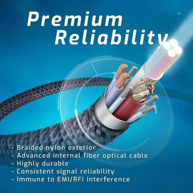 Premium Reliability: Braided nylon exterior over advanced internal fiber optical cable for highly durable and consistent signal reliability immune to EMI/RFI interference