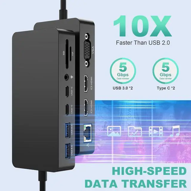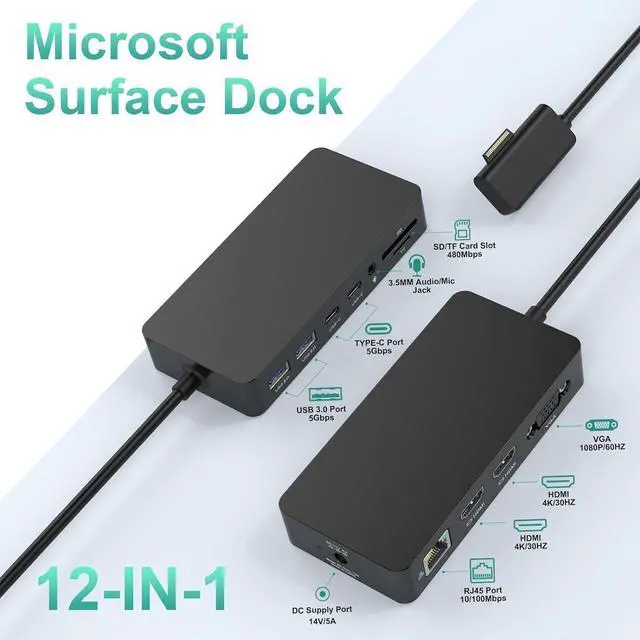 12-in-1 Surface Dock Portable & Powerful Work StationThe Surface pro docking station uses surface connection technology, which has high-speed transmission of video, audio and data keep your desktop tidy. Rocketek Surface Docking is designed with 2x 4K HDMI ports, VGA port, Gigabit RJ45 port, 2x USB C Data port, 2x USB 3.0 Ports, SD/TF Micro SD card slot, 3.5mm Headphone Jack Port, Surface pro 8 dock meet all your connecting needs in a dock. Surface dock With simple plug and play connectivity