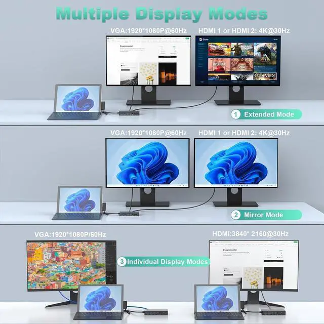 4K HDMI Output & Triple Display Surface Pro DockThis Surface Pro 8 dock station will help you to easily achieve dual&triple monitor display,meets all your needs and make your work easier; 4K HDMI support resolutions up to 3840 x 2160@30Hz. VGA port supports display resolutions up to 1920 x 1080@60Hz. *Note: Connect a surface with up to 3 screen and reach three displays (HDMI/HDMI/VGA +Surface). When you need to connect 3 monitors, you need to turn off the Surface screen.