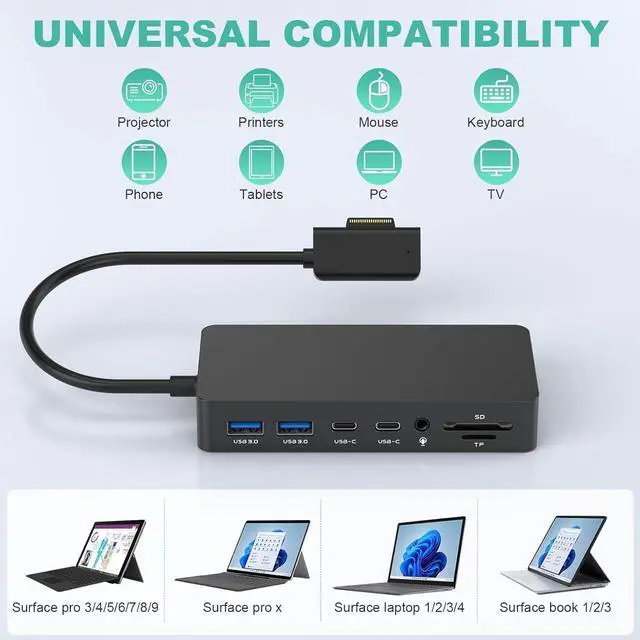 Surface Pro Dock Strong Compatibility This 12 in 1 Surface docking station compatible with Microsoft Surface Pro 9/8/X/7/6/4/3/2017, Surface Laptop studio 4/3/2, Surface Laptop go, Surface Laptop, Surface Book3/2/1. Surface pro 8 docking station creating more value for work. Note: please check if this Surface docking station is compatible for your device before purchase,Please connect the magnetic surface connection correctly to your surface according to the direction in Figure 5.