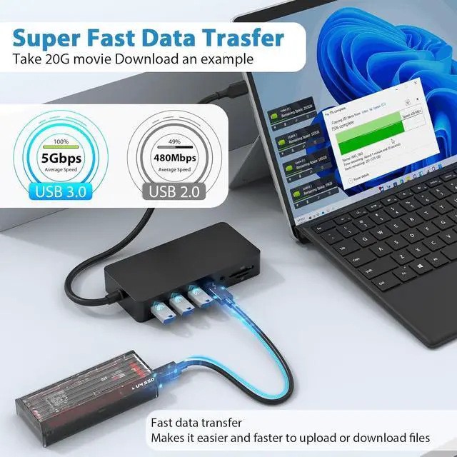 Super Speed Data Transfer Surface Docking Station: This Microsoft Surface Pro docking station comes with 3 usb 3.0 ports and usb c port,the transfer speed of them are up to 5Gbps, allows you tranfer files in seconds from your usb flash driver, usb/usb c hard disks. In addition, The Surface laptop docking station with compact body also insert SD and TF slots. You can transfer photos to your Surface laptop with highest speed up to 104MB/s.