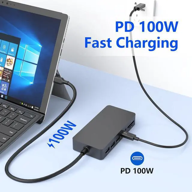 100W Power DeliveryThe power port of USB C Surface HUB supports up to 100W power input and up to 100W (safe) power output to charge laptops and tablets. So you can safely charge your laptop while connecting multiple peripherals for data transfer and hassle-free power storage. (Note: The TYPC C charging port of the usb c multiport adapter only supports the charging function. It does not support the video output function.).