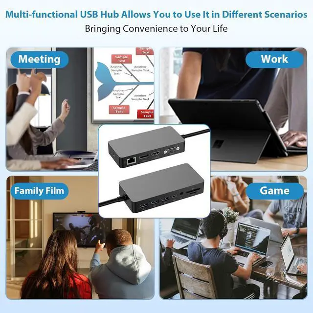 Minimal Design and Easy to UseThe 12 in 1 microsoft USB C surface docking station upholds a minimalist style, simply connect the peripheral to the Surface Dock. All it takes is one surface pro accessory to give your desktop a fresh, clean look.The 12-in-1 USbB C surface docking station has the interfaces you may need, and 12 interfaces can be used at the same time.