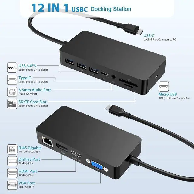 Multi-Functional 12 IN 1 Microsoft USB C Surface DockEquipped with USB C Connection technology, this triple display USB C Surface pro docking station offers a range of connectivity options for all your peripherals with HDMI port, DP port,1080P VGA port, 1000Mbps Gigabit RJ45 port, 1*100W PD USB C data port, 3x USB A 3.0 Ports, SD/TF card slot, 3.5mm Headphone Jack Port, 5V Micro USB Power Port. USB C Surface dock HUB to meet your expansion needs.