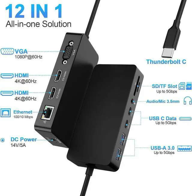12-in-1 USB-C Thunderbolt 4 Docking StationOptimized for USB4 devices, this versatile 12-in-1 USB-C/USB4 docking station expands your workspace with Dual HDMI (4K@60Hz), VGA (1080P@60Hz), 1000Mbps Ethernet, 2× USB-C data ports, 2× USB-A 3.0 ports, SD/TF card slots, a 3.5mm audio jack, and a 100W DC power inputproviding simple and stable plug-and-play connectivity for daily work.