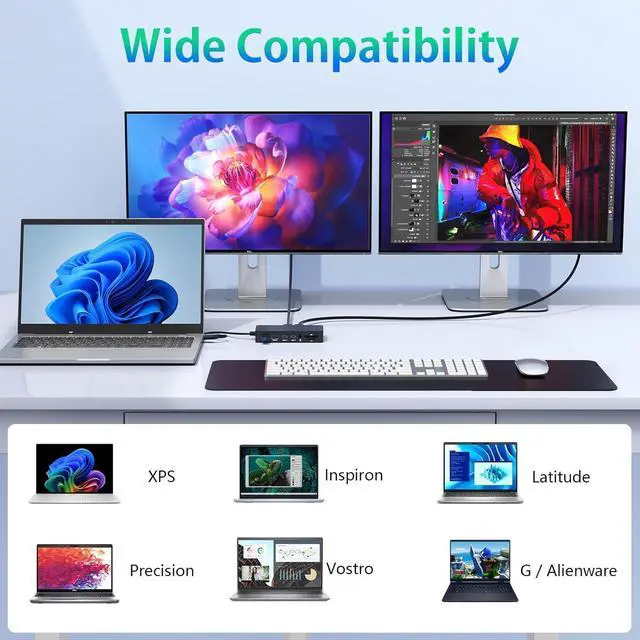 Broad Compatibility with Dell ModelsEquipped with USB-C or USB4 ports, Compatible with Dell XPS, Inspiron, Latitude, Precision, Vostro,G / Alienware. Such as DellXPS139350, DellXPS139345, Dell16Premium,Dell14Premium, Dell14Plus, DellInspiron14/15, Dell14Laptop, Dell15Laptop, DellLatitude3140, DellLatitude7350, DellLatitude7320, DellPro16PC1625,etc.