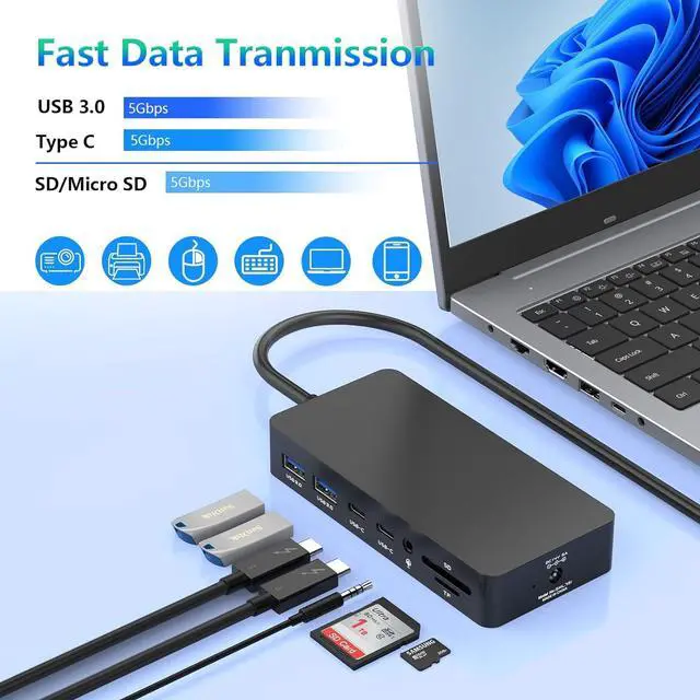 Super Speed Data Transfer Thunderbolt 4 Docking StationThis USB4 docking station comes with 2 usb 3.0 ports and 2 usb c port,the transfer speed of them are up to 5Gbps, allows you tranfer files in seconds from your usb flash driver, usb/usb c hard disks. In addition, The laptop docking station with SD and TF slots, you can transfer photos to your device with highest speed up to 5Gbsps.
