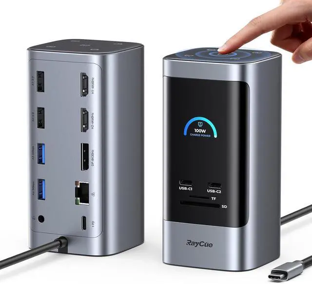 RayCue USB C Docking Station, 15 in 1 Triple Display with 5 Shortcut Button, 8K HDMI and DP, 10Gbps USB A/C, Gigabit Ethernet, 100W PD, Audio, Laptop Docking Station for Windows/Dell/HP/Lenovo/Mac
