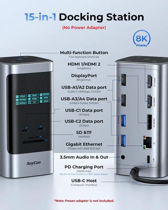 [15 in 1 Huge Expansion]:Equipped with 2 HDMI ports(4K@60Hz), a DisplayPort connectors(8K@30Hz), 2 USB-C data port (10Gpbs & 5Gpbs), 4 USB-A ports(5Gpbs & 480Mbps), SD/TF card reader (160MB/s), Gigabit Ethernet (1Gbps), 3.5mm AUX jack, 100W USB-C PD input port and 5 Shortcut Button.