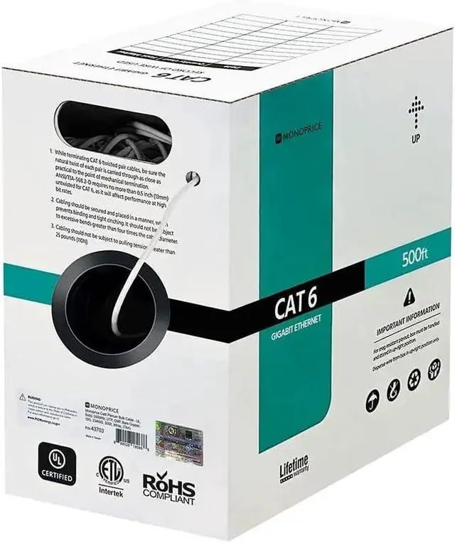 Unshielded Twisted Pair (UTP) Category 6 Ethernet cable. 23AWG solid, pure bare copper conductors. CMP (Plenum) fire safety rating. IEEE 802.3af (PoE) / IEEE 802.3at (PoE+) Power over Ethernet compliant. Test up to 550MHz bandwidth.