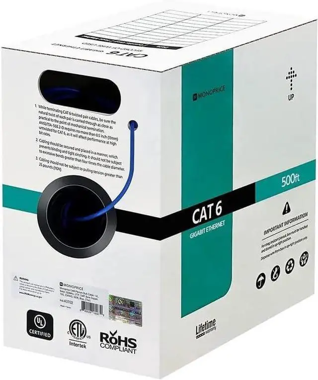 Unshielded Twisted Pair (UTP) Category 6 Ethernet cable. 23AWG solid, pure bare copper conductors.