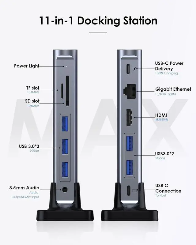 11-in-1 Expansion - CB-D54 vertical docking station is powerful than USB C hub with 5 USB 3.0, 4K HDMI, Gigabit Ethernet, SD/Micro SD card reader, 100W power delivery, and 3.5mm audio port. Up to 100w pass through the charging port can provide 85w for laptops. Plug and play, no drivers or software to install