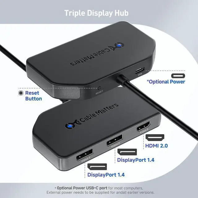 Low Power Consumption: This mini displayport hub is designed for efficiency, able to be bus-powered in most setups. For systems with lower power output, such as the Microsoft Surface Pro, an optional USB-C power port is available, preventing any flickering or connectivity issues.