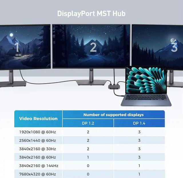 Triple Monitor Support: As a triple monitor adapter, this hub maximizes your productivity and entertainment options, allowing for a powerful and immersive multi-display setup that leverages the advanced capabilities of DisplayPort 1.4 technology.