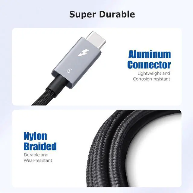 Advanced Aluminum Connectors: Engineered with precision, the Thunderbolt 5 cable is equipped with aluminum connectors for improved heat dissipation and a premium, secure connection. The rugged Thunderbolt cable braided design guarantees reliable performance even with frequent plugging and unplugging.