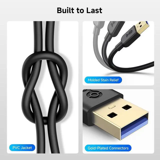Premium Type A USB 3.0 cable engineered with molded strain relief connectors for durability and grip treads for easy plugging and unplugging. Enjoy SuperSpeed USB 3.0 data transfer rate at up to 5 Gbps, 10x faster than USB 2.0