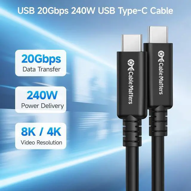 Long USB C All in One Cable: Step into the future of USB with the Cable Matters USB4 to USB4 Cable; USB Type C to USB Type C cable supports the latest USB4 standard for up to 20Gbps of bandwidth, 8K video support, and 240W charging; This USB C to C Cable supports USB PD 3.1 Extended Power Range (EPR) including 28V/140W, 36V/180W and 48V/240W