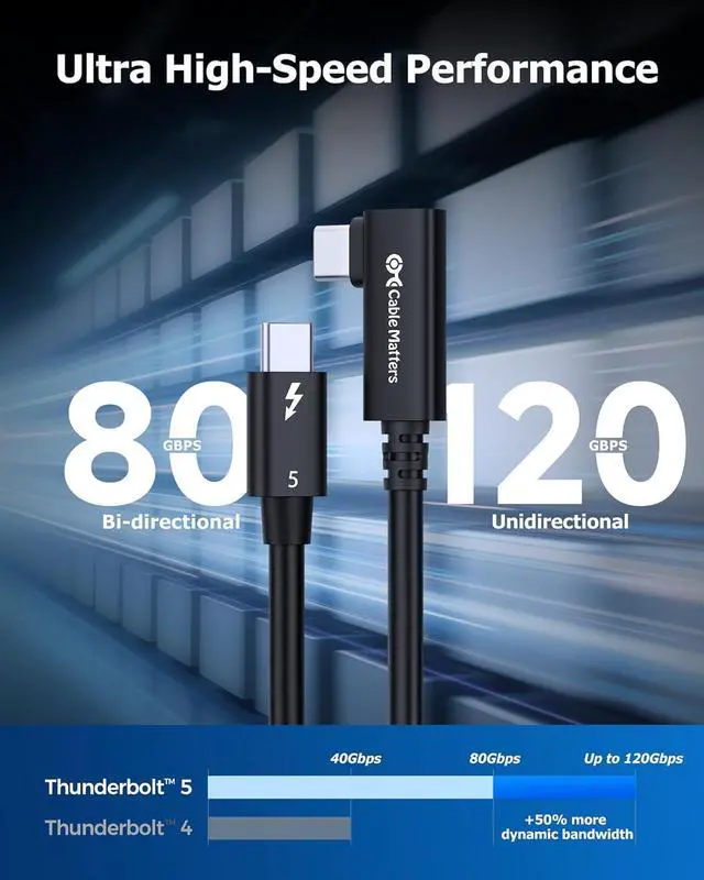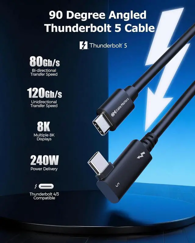 Universal Compatibility: The 90 degree Thunderbolt 5 cable connects seamlessly with Thunderbolt 3, Thunderbolt 4, USB4, and USB-C devices. Whether you're using the latest laptops, high-resolution monitors, external SSDs, or docking stations, this cable offers plug-and-play flexibility with full backward compatibilityideal for professional and home office setups alike.