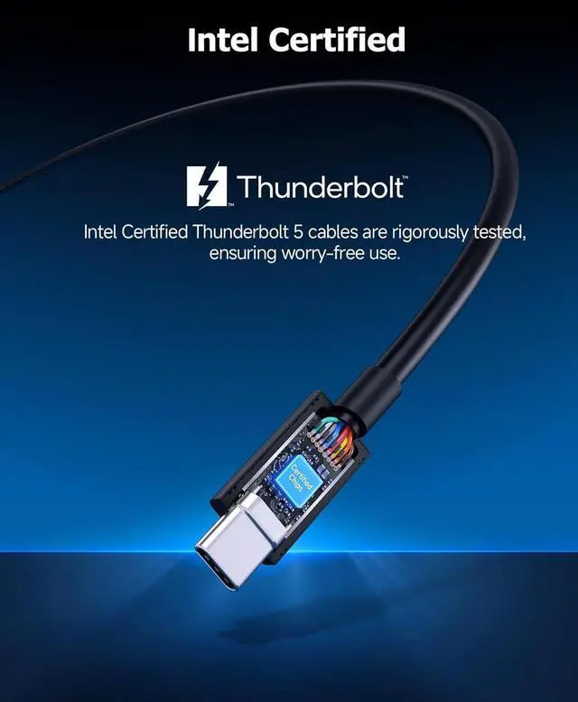 Built for Reliability: Certified to Intel Thunderbolt standards, this Thunderbolt 5 cable with 90 degree connector undergoes rigorous testing to ensure stability, safety, and consistent performance. The angled design also enhances durability in professional setups by reducing strain at the port, ensuring reliable daily use across high-demand environments.