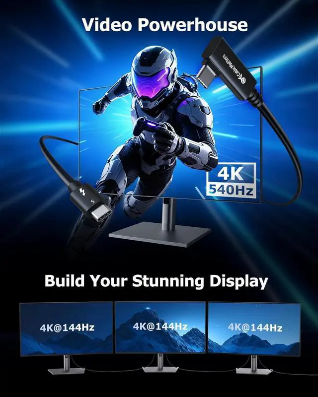 Dual 6K or 8K Display Support: Empower your visual experience by connecting dual 6K or dual 8K or triple 4K @144Hz displays, which provide stunning, detailed visuals that are crucial for graphic design, video editing, and other professional applications that require superior display clarity and detail. This Thunderbolt 5 right angle cable is optimized for multimedia professionals and content creators who rely on precise color accuracy and sharp image quality for their projects.