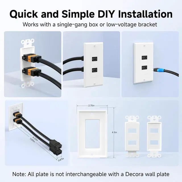 Two-piece 4K HDMI wall outlet with included faceplate and 2 Port HDMI insert makes connecting the cables easier; Simple installation of HDMI wall plate 2 port insert with the included mounting screws