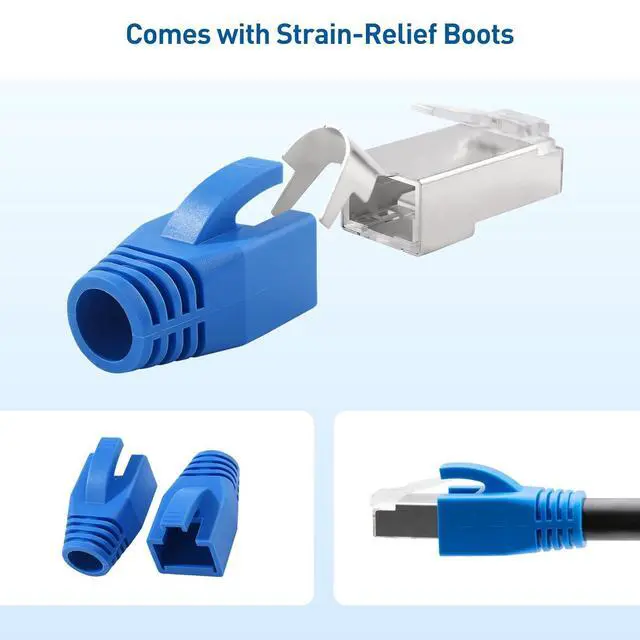 Durable Construction for Optimal Performance: The superior construction of these cat8 rj45 connectors pass through guarantees maximum connectivity and flawless network performance. The included strain relief boots enhance durability and prevent cable damage, while the superior shielding effectively prevents network interference.