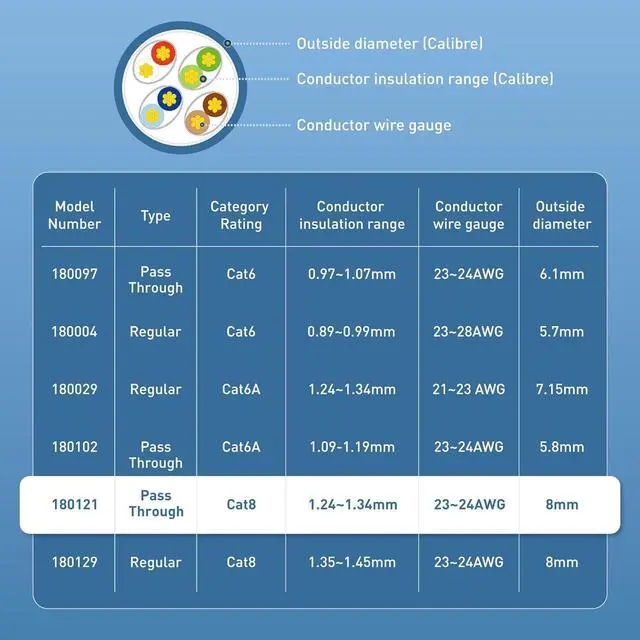 Wide Cable Compatibility: These Cat8 shielded RJ45 connectors are compatible with 23-24 AWG Cat8 cables, accommodating a conductor insulation range of 1.24mm to 1.34mm and an outside diameter of up to 8mm. They enable you to enjoy superior network performance with custom-built Cat8 Ethernet cables, ensuring your connections are both secure and efficient.