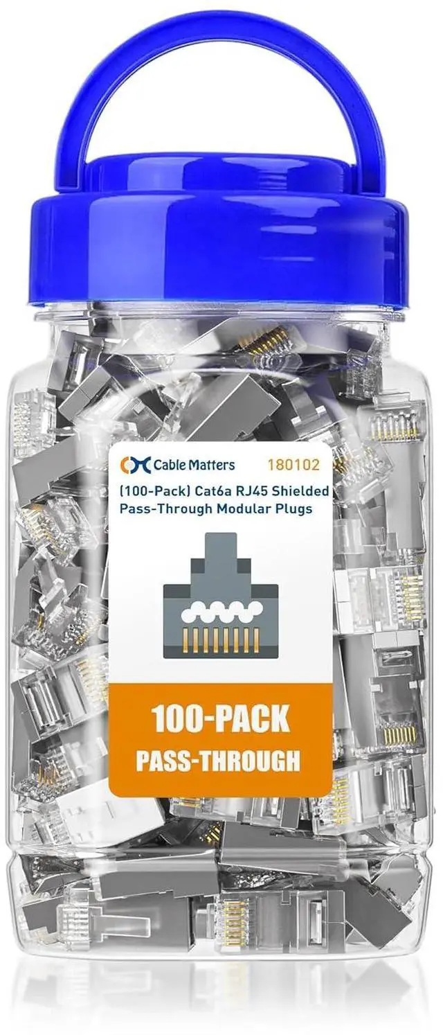 Cost-effective 100-pack of Cat 6A RJ45 modular connectors provides enough connectors for a large project or multiple small jobs; Construct multiple Cat6A patch cables in the perfect length for a router, patch panel, or workstation application with this crimp connector; Cat 6a crimp connectors are also compatible with Cable Matters RJ45 Strain Relief Boots to protect the cable from accidental damage and bolster the integrity of the cable