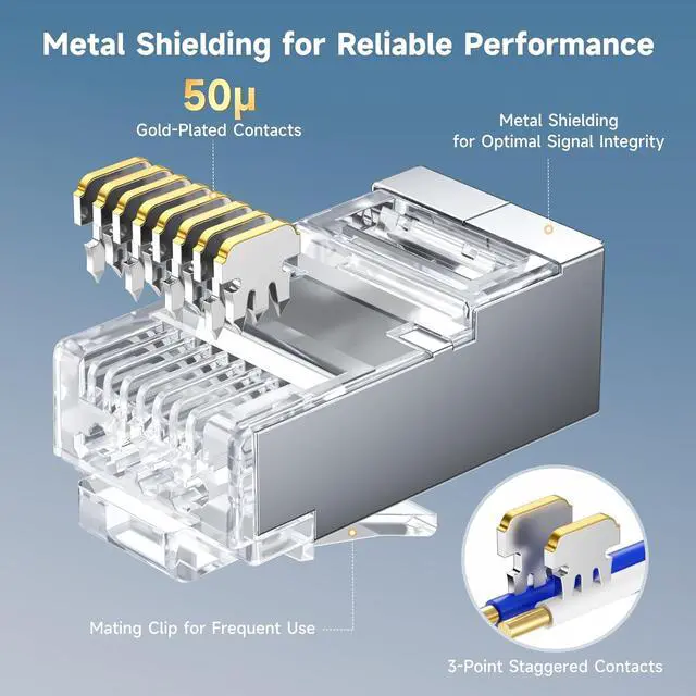 Category 6A performance rated for 10Gbps / 10GBASE-T Ethernet channel compliant network; Backward compatible with Cat6 cable and Cat5E cable, allowing the connectors to also function at Cat6 connectors and Cat5e connectors; Use the plugs with existing older cable to form Cat6 plugs and cat5e plugs; Gold-plated contacts on the 8P8C network connectors provide superior transmission and resist Cat6A cable corrosion