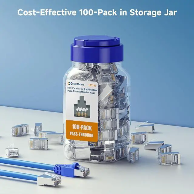 Convenient jar storage container protects and stores the Cat6A RJ45 modular connectors until your next project; Screw-on lid with an integrated handle makes it easy to carry the RJ45 ends to the job site; A lifetime warranty is included with these RJ45 plugs for peace of mind when purchasing these Cat6a RJ45 pass-through connectors