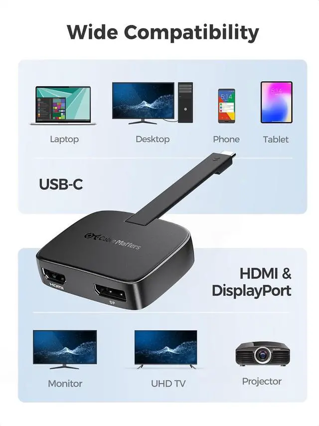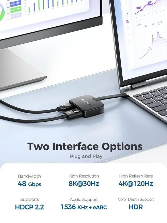 The foldable USB-C to HDMI DisplayPort adapter features support for ultra high definition video; Connect up to one 8K 60Hz or 4K 144Hz monitor, or dual 4K displays with this USB type C to HDMI DisplayPort adapter