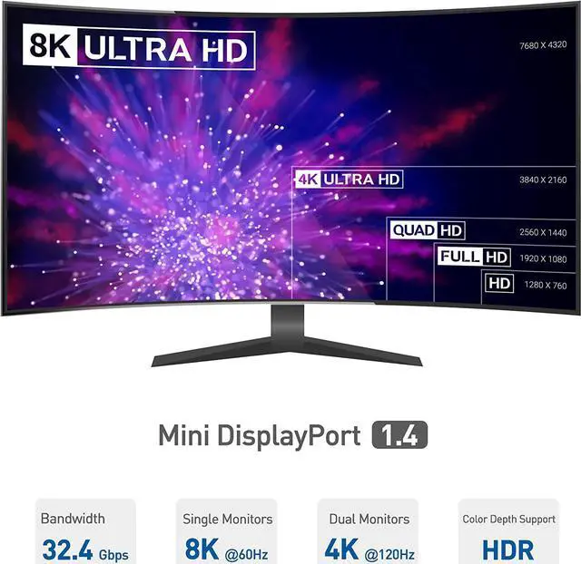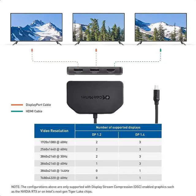 Utilizing the newest DisplayPort 1.4 high speed HBR3 data rate at 32.4 Gbps bandwidth and Display Stream Compression 1.2 (DSC), this Mini DisplayPort hub supports up to either a single 8K@60Hz monitor, dual 4K@120Hz monitors, or triple 4K 60Hz monitors (requires DisplayPort 1.4 and DSC 1.2 support from graphics card).