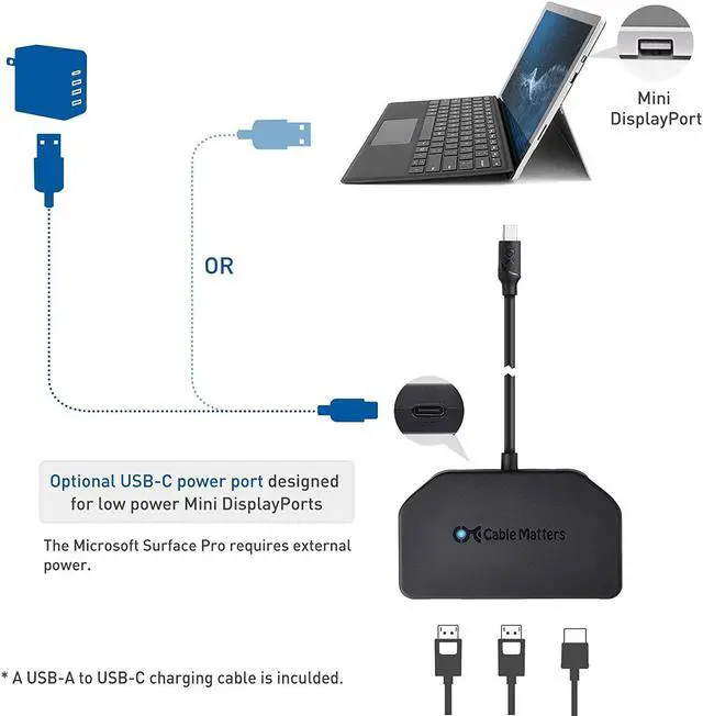 Mini Display Port hub features a low power consumption design that allows it to be bus powered on most systems. The Mini DisplayPort 1.4 splitter contains an optional USB-C power port for use with computers with a low power output Mini DisplayPort, such as the Microsoft Surface Pro. Plug in the included USB power cable if there is disconnecting / flickering / blinking issue